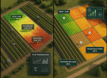 Esta información permite detectar zonas con estrés hídrico, deficiencias nutricionales o enfermedades, optimizando las decisiones de riego, fertilización y manejo del cultivo.